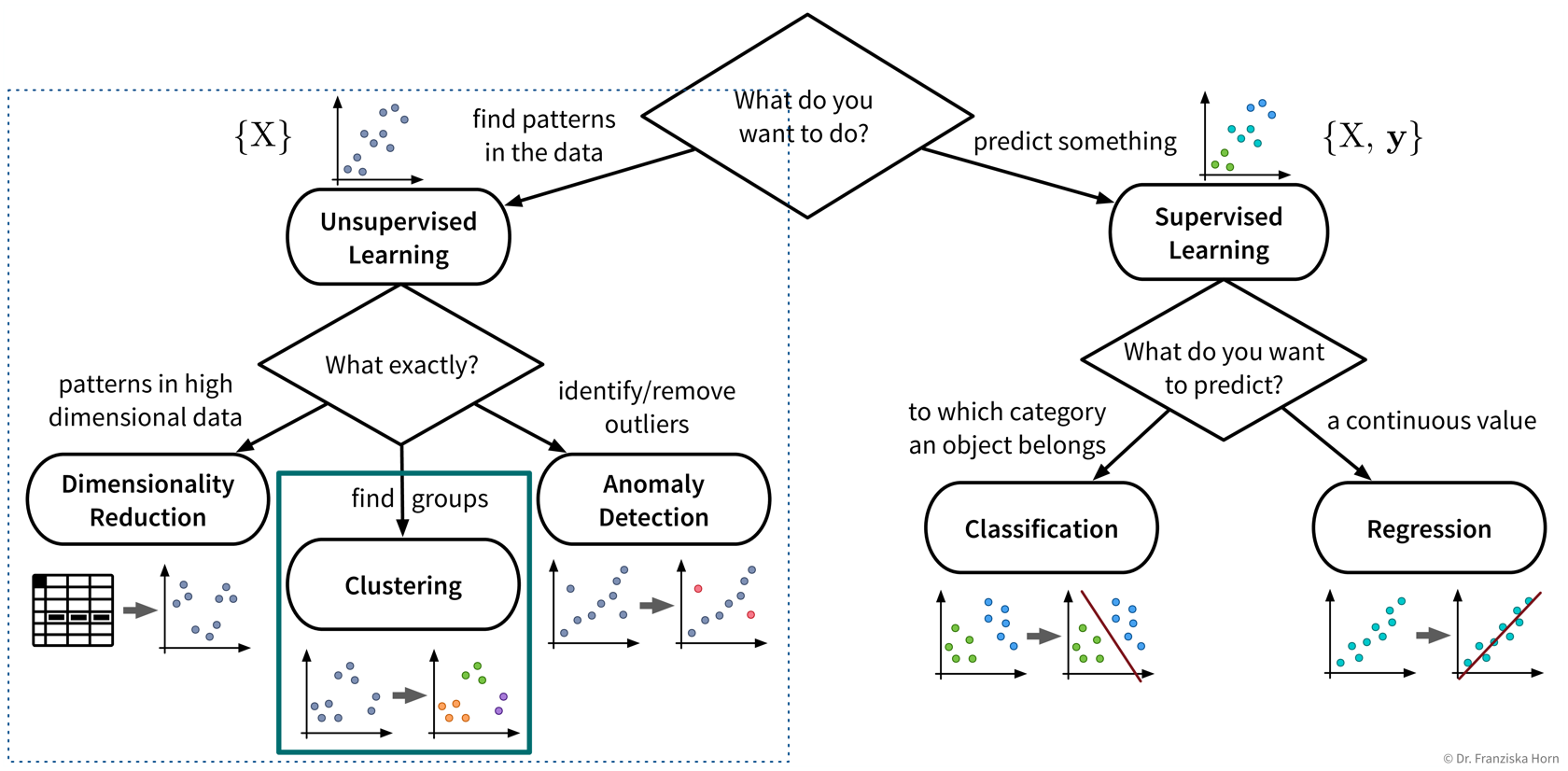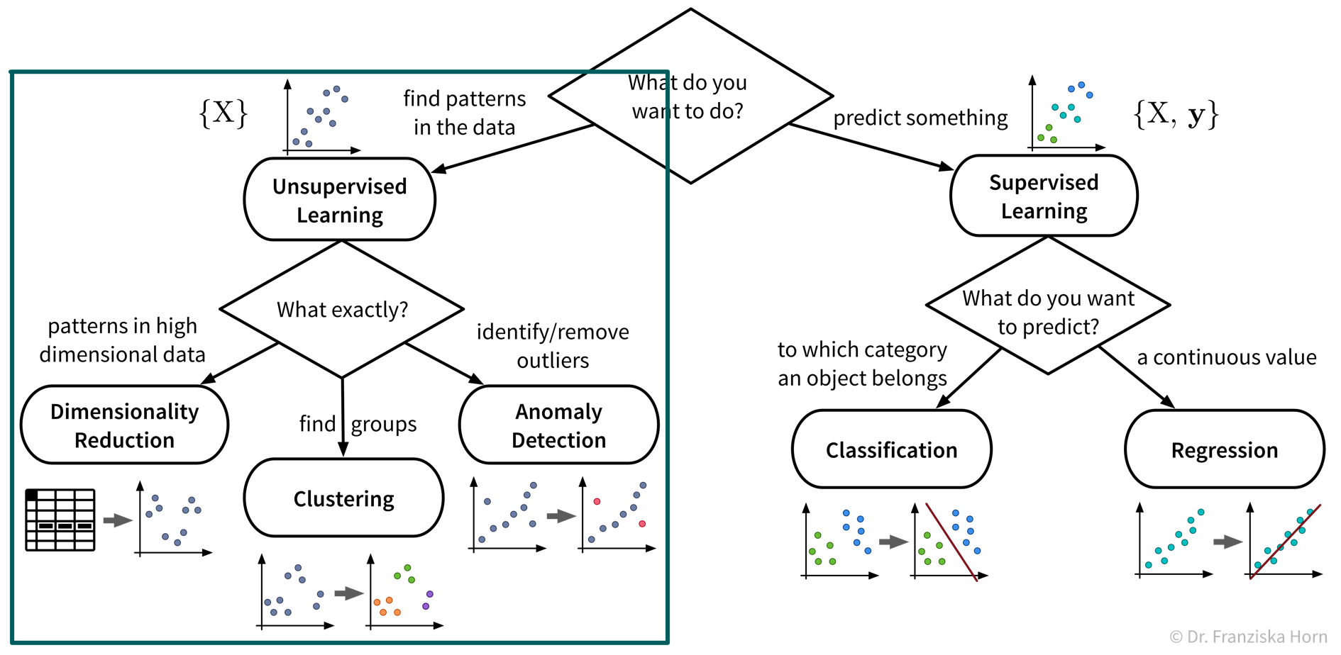 While the subfields of unsupervised learning all include lots of different algorithms that can be used for the respective purpose, we’ll always just examine a few example algorithms with different underlying ideas in more detail. But feel free to, e.g., have a look at the sklearn user guide for more information about other methods.