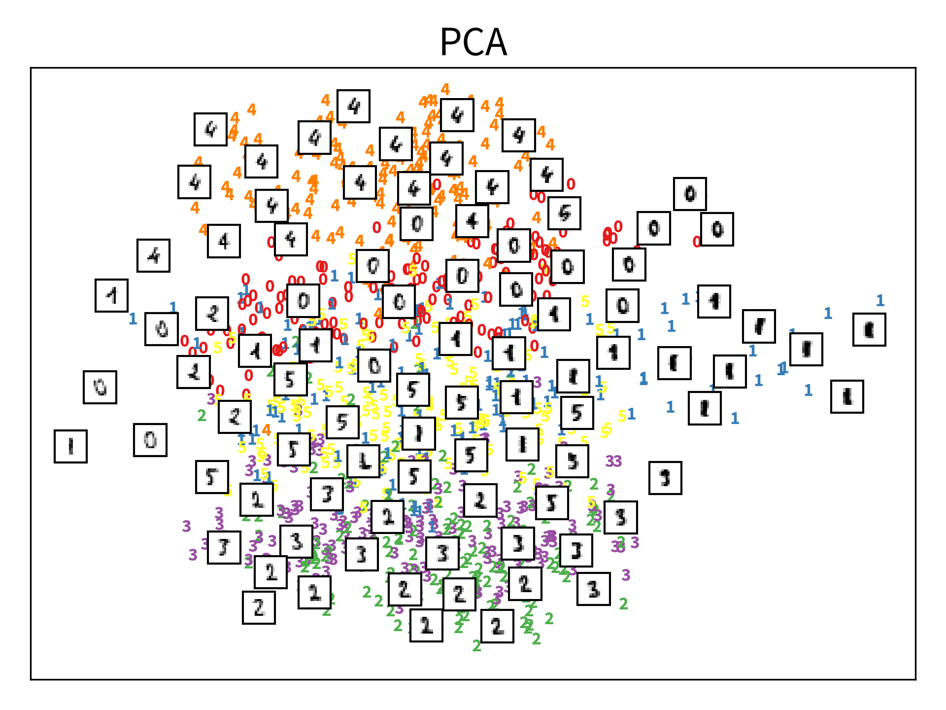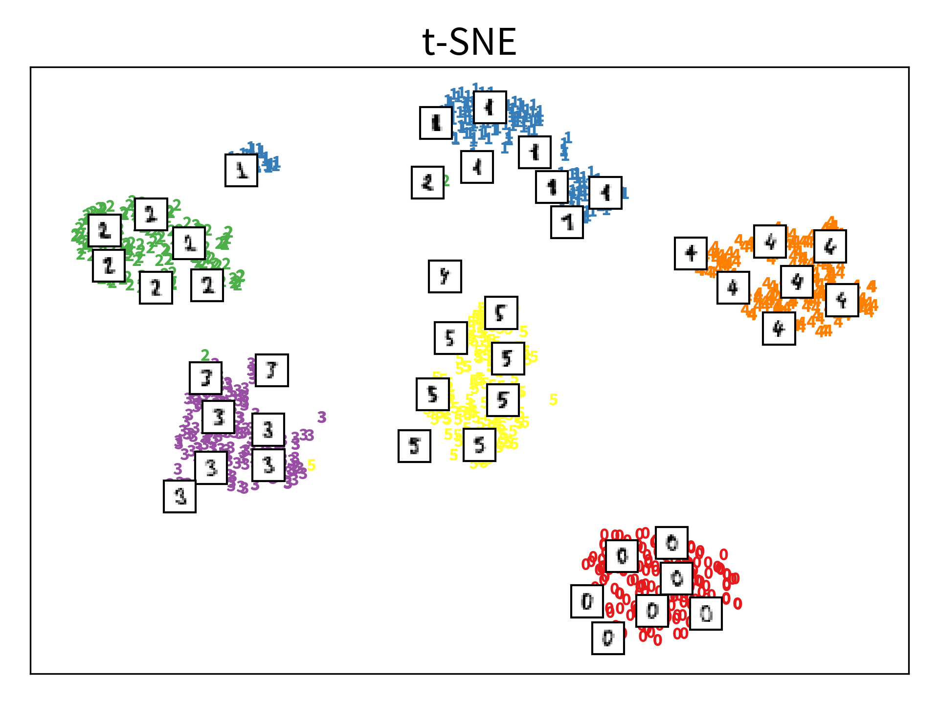 The remarkable thing here is that these methods did not know about the fact that the images displayed different, distinct digits (i.e., they did not use the label information), yet t-SNE grouped images showing the same number closer together. From such a plot we can already see that if we were to solve the corresponding classification problem (i.e., predict which digit is shown in an image), this task should be fairly easy, since even an unsupervised learning algorithm that did not use the label information showed that images displaying the same number are very similar to each other and can easily be distinguished from images showing different numbers. Or conversely, if our classification model performed poorly on this task, we would know that we have a bug somewhere, since apparently the relevant information is present in the features to solve this task.