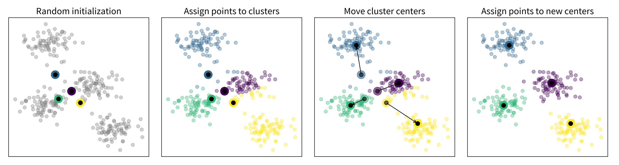 - Randomly place k cluster centers (where k is a hyperparameter set by the user);