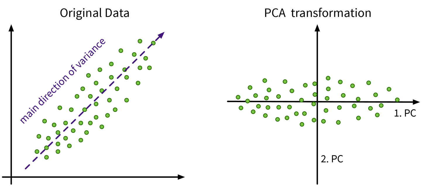 By computing the eigenvalues and -vectors of this matrix, the main directions of variance in the data are identified. These are the principle components and can be expressed as linear combinations of the original features. We then reorient the data along these new axis.